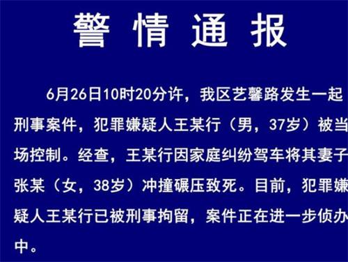 6月26號,山東東營一個男子因為家庭糾紛開車多次碾壓自己的妻子導致妻子死亡,引發了大眾的關注。6月27號山東東營公安局東營經濟技術開發區分局也在網絡上第一時間公布了警情通報。在通報中公布王某行因為家庭糾紛,開車將自己的妻子張某沖撞碾壓致死,行為惡劣已經被公安刑事拘留,案件還正在進一步偵查中。