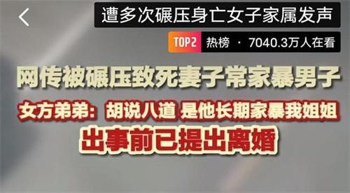 6月28號,女方弟弟正式回應該事件是我姐姐長期被男方家暴,事發之前姐姐已經向男方提出了離婚。關于男方碾死妻子疑因遭家暴的說法女方弟弟也作出了回應,根本不存在女方家暴男方的事情,而是男方一直在家暴女方。結婚兩年的時間有一年半的時間都是男方在家暴女方,就在事發的前一天男方又對女方施暴,最后女方的家人趕來之后才把女方救出,之后報警誰知第2天就發生了這個事情,居然還有網友在網上胡說八道說是女方家暴男方。