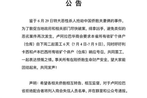 盧阿巴拉華僑商會。此前就發(fā)布了安全預警,提醒了各單位需要加強安保建設,特別是外出人員的安全,也建議不要身上攜帶大量的現款,這一次的事件也使商會更加強調所有人員的安全問題,也希望可以通過懸賞和罷工的舉措,使當地政府與有關部門采取措施,保證華僑的生命安全以及財產安全。