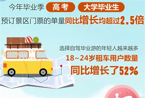 每年的畢業季都是畢業生外出游玩的高峰期,雖然很多學生心中還有不舍,不過通過這種充滿儀式感的方式致敬自己的青春也是很多人會才去的方式。在最近一周的時間里,對于“畢業旅行”的關鍵詞搜索量同比增長1139%,還有不少人都做了類似的攻略筆記;高考畢業生預訂長途旅游的比例高達40%。在今年畢業季,高考結束的學生和大學畢業生預訂景區門票的單量同比增長超過2.5倍,我國壓抑許久的旅游潛力被釋放,最具有消費潛力的學生群體開始釋放自己的活力,向整個旅游市場注入動力。