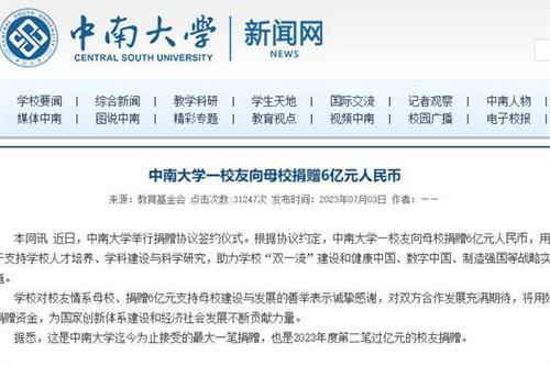 中南大學官網(wǎng)近日有消息表示該學校舉行捐贈協(xié)議簽約儀式,有一位校友向?qū)W校捐贈了6億元人民幣,用來支持學校的人才培養(yǎng)以及學科建設。