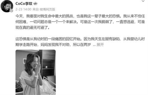 在今年的2月23日,李玟曾經(jīng)發(fā)過(guò)微博稱今天是他最大的一個(gè)挑戰(zhàn),也是他最大的恐懼,他從來(lái)不害怕任何困難,一切問(wèn)題都是需要一個(gè)一個(gè)解決。但是他這一次變得脆弱了,都想要逃避,現(xiàn)在已經(jīng)到達(dá)了避無(wú)可避的狀態(tài),表示自己的左腿有缺陷,也是從幼兒時(shí)期學(xué)錄開(kāi)始的,雖然去進(jìn)行了手術(shù),但是沒(méi)有能夠成功,他覺(jué)得當(dāng)時(shí)非常的難受,也讓他的內(nèi)心變得極度恐懼。