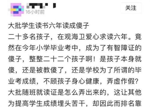 這名網(wǎng)友還在文章中表示,這所學校共有22名學生,然而孩子讀書六年之后卻拿到一張仿佛宣示著自己“傻子”身份的智障證,還質疑學校是為了提高成績排名才這樣做的,還表示,這種以傷害他人的形式來獲取成績的形式,實在有違師德。在文章末尾,這名網(wǎng)友放上了一份包含22位學生的名單,在文中網(wǎng)友憤怒地表達了自己對于學校這種行為的不齒,還發(fā)表了個人意見,認為學校不應該采用這種方式給孩子們貼上標簽,這對于他們今后的成長極為不利。