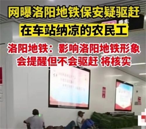 7月10日有網友發布視頻稱河南洛陽某地鐵站中在地鐵通道里避暑的農民工遭到了地鐵工作人員的驅趕,7月11日下午洛陽地鐵客服工作人員回應記者,地鐵是公共區域,不會進行驅趕,但是不提倡在車站內納涼。