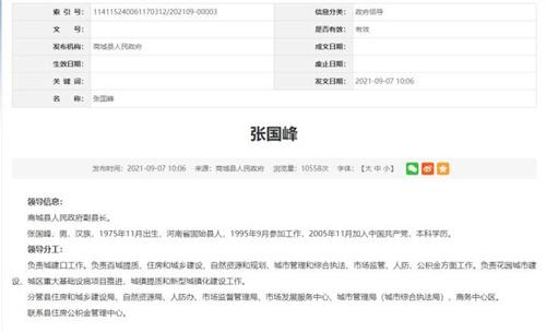 網友在向記者爆料時表示自己關于中國豐收會這一問題已經進行過了多方面的證實,法院所公開的判決書中講到的,張某就是在當時正在擔任固始縣方集鎮鎮長的張國峰。隨后記者也了解到,張國峰在2011年的12月19日離開方極限,正是擔任了商城縣的副縣長,從商城縣的人民政府網站所顯示的公開消息,也可以發現張國峰現在為商城縣人民政府的副縣長。