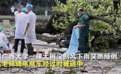 廣西大學校園內一棵大樹傾倒,一名老師被砸中身亡,校方對此事進行了回應,表示確有此事,相關部門正在對此事進行處理調查。