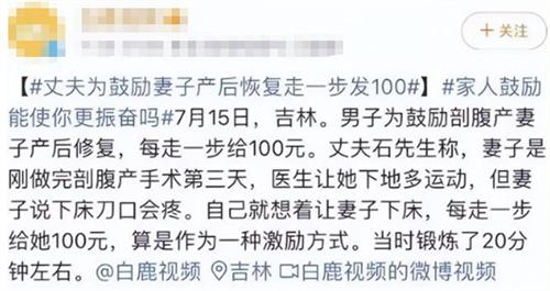 根據7月20日的新聞報道,位于吉林一位男子在7月15日為了鼓勵自己剖腹產的妻子進行下床活動,每走一步給100元。據了解丈夫石先生表示,自己的妻子是剛做完剖腹產手術,第3天的時候,醫生建議下床多運動,但是妻子表示下床運動的時候傷口會疼,石先生想讓自己的妻子早點下床,早做恢復,于是每走一步給100元,屬于一種激勵的獎勵,目的是讓妻子下床多運動一下,在當時大概鍛煉有20多分鐘。