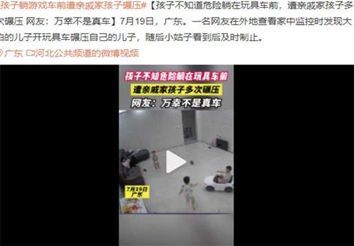 網(wǎng)友查看家里視頻時(shí)發(fā)現(xiàn)大伯的兒子開(kāi)著玩具車(chē)不斷碾壓自己的兒子,被小姑子看到后及時(shí)制止。7月19號(hào)廣東一名網(wǎng)友發(fā)布一則視頻,在視頻里面能夠看到有一個(gè)小孩子開(kāi)著玩具車(chē)不斷去碾壓另外一名幼兒。網(wǎng)友看到該視頻之后紛紛留言幸好不是真車(chē)。該事件也引發(fā)了網(wǎng)友的關(guān)注認(rèn)為給孩子提高危險(xiǎn)意識(shí)是一件非常重要的事情。