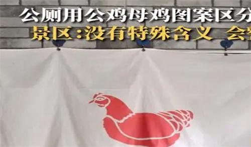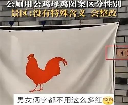 沒有什么特殊的含義也沒有任何寓意,相關情況我也會向上面領導反映申請整改。北京時間7月21號根據白鹿視頻報道,近日河北邯鄲有一個游客在網上發一則視頻,稱某景區用公雞和母雞的圖案區分男女廁所引發關注。根據網友拍攝的視頻顯示景區公廁男女廁所門口的遮擋布上印著兩個不同的圖案,女廁所門口印著的是紅色母雞圖案,而男廁所門口印的這是紅色公雞圖案。