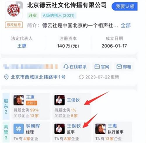 隨著這位知情人士將詳細細節爆料出來之后,也揭露了岳云鵬經紀人的身份,王俁欽。這只是岳云鵬的經紀人同時還是郭德綱現在的妻子王慧的弟弟,王俁欽要管郭德綱叫姐夫,吉林更要管岳云鵬的經紀人叫舅舅。除了是郭德綱的親戚之外,同時岳云鵬的經紀人還是德云社文化傳播有限公司的監事以及股東,持有德云社文化傳播有限公司1%的股份。