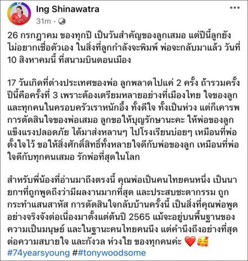 北京時間7月26日,泰國媒體進行了相關報道,泰國前總理將會結束自己的自我流亡,預計將會在8月10號的時間回到泰國,不過回到泰國以后,他將會可能面臨高達十年左右的牢獄之災。這個消息也是他的女兒在這個平臺當中放出來的,他表示自己的父親將會在8月10號抵達曼谷國際機場,對于他父親而言,想要回到國家的愿望近些年來變得更加的迫切,所以將會在八月份迫不及待的回到泰國,同時他女兒表示自己的父親是一名泰國人,而且還是泰國的前總理,在思考了許久以后,還是毅然決然的決定返回國家。
