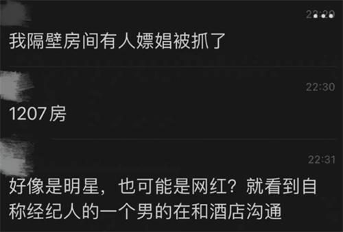 7月26日有一位狗仔曝光在北京某酒店休息時遇到隔壁房間1207的某位明星嫖娼被抓。根據他的介紹,這位明星來頭不小,被抓之后還叫來自己的經紀人處理此事,期間一直在與酒店方面進行溝通,避免事情被曝光。