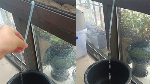 據當事人魏先生表示,門窗有很多積水沒有辦法及時的排出,之前在物理書上曾經教過,于是簡單的運用一下,用小吸管排水,直接將門窗上的水全部排出,足足排了大概兩桶。有的網友看到表示自己小的時候就玩過,是一根吸管用嘴將水吸出來,這屬于虹吸現象。