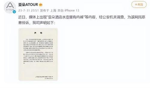 7月25日,有網(wǎng)友在網(wǎng)上爆料稱自己入駐蘇州工業(yè)園區(qū)青劍湖亞朵酒店時(shí),發(fā)現(xiàn)該酒店房間水壺中有內(nèi)褲,并且存在很多衛(wèi)生打掃不徹底不干凈的情況。7月31日,上海亞朵商業(yè)管理有限公司對(duì)此事發(fā)出聲明省稱是有有網(wǎng)友惡意投訴,目前公司已報(bào)警處理,該人已被公安機(jī)關(guān)依法采取強(qiáng)制措施。