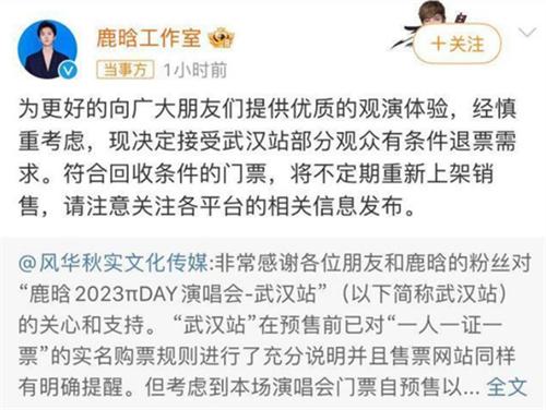 不過這一次退票是有一定條件的,主辦方要收取20%的門票費用,而粉絲們也需要承擔個人0.6%的票價費用,這一點也是能夠理解的,畢竟主辦方也是需要賺錢的,鹿晗工作室的團隊表示,要是因為學業,工作以及其他不可抗力的因素導致自己沒有辦法來觀看演唱會,是可以進行退款的。而對于所有回收回來的門票也將會再次進行出售,但具體的時間并不知曉,還是需要注意各個平臺發布的相關信息,對于那些沒有能夠搶到鹿晗演唱會門票的粉絲還有機會。