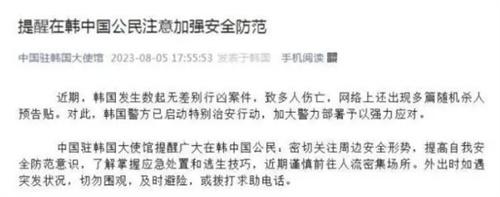 8月5日,據中國駐韓國大使館微信公眾號消息,近期韓國發生的多起無差別行兇事件,這些事件造成了多人死亡,網絡上還出現了很多隨機殺人的預告片。針對此事,韓國警方已經啟動了特別治安管理行動,將會加強警力部署,對這些行為進行強力應對,中國駐韓大使館方面提醒眾多在韓的中國公民,要密切關注周邊的安全狀態,提升自我的防范意識。