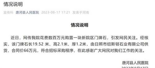 北京時(shí)間8月17日,有網(wǎng)友爆料稱河南省唐河縣人民醫(yī)院花費(fèi)了數(shù)百萬元購買了一塊新院區(qū)的門牌石,這個(gè)行為也是引發(fā)了網(wǎng)友們的質(zhì)疑,對于網(wǎng)絡(luò)上面的這件事情,目前該醫(yī)院也是進(jìn)行了專門的回應(yīng),表示該門牌石長度為19.2m,高為2.1m。厚度為1.2m,雙方簽訂的合同價(jià)格為66萬元。根本不是網(wǎng)友所說的上百萬元,而且也是正常的采購程序,沒有任何的違法行為和貪污受賄行為。