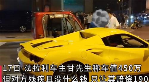 事情是發生在8月15日,有一輛法拉利跑車在上海被老人代步車刮蹭,出現后視鏡損壞的情況,車主并沒有向對方索要更多的賠償,只是老人被索賠190元。記者是在8月17日聯系到車主甘先生,甘先生表示這輛車價格是450萬元,在當時自己屬于直行車道等待紅燈,老人駕駛的時候不小心碰到自己車的后視鏡。自己在當時是有事情要辦,于是不想過多的追究,只是象征的向老人索賠190元。目前4s店定損后視鏡需要1萬左右的費用,后期自己會自行進行維修處理。