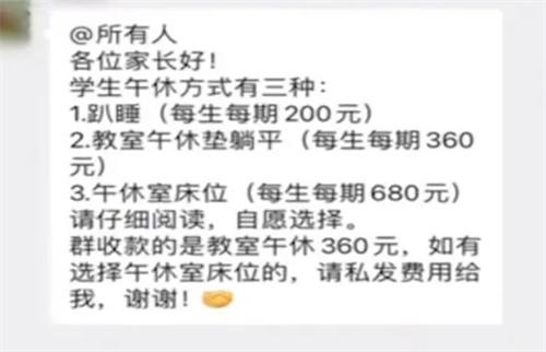 據(jù)悉該學(xué)校是東莞市虎門捷勝學(xué)校根據(jù)網(wǎng)友截圖,能夠看到在一個微信群里面有一個老師向家長們收取午休費(fèi)用,每個學(xué)生每學(xué)期趴在桌子上午睡將會收取200元,在教室里的午休墊躺平睡覺收取360元,午休室的床位每學(xué)期要繳納680元,根據(jù)家長自愿選擇。