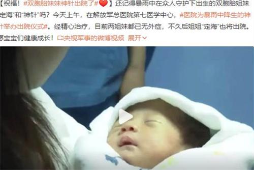 在暴雨中平安降生的雙胞胎姐妹定海和神針,8月29號妹妹神針徹底康復(fù)出院,因北京門頭溝區(qū)醫(yī)院不具備早產(chǎn)兒的治療條件,定海和深圳兩姐妹出生之后就被門頭溝醫(yī)院迅速轉(zhuǎn)運(yùn)到解放軍總醫(yī)院第七醫(yī)學(xué)中心兒科醫(yī)學(xué)部救治,經(jīng)過醫(yī)生護(hù)士的專業(yè)治療神針和定海兩姐妹都已經(jīng)沒有任何外癥,姐姐定海也將會在不久的時間康復(fù)出院。