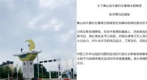 近日河南魯山縣的牛郎織女愛情主題雕塑受到了人們的關注,魯山縣已經成立聯合調查組,經過初步調查之后,決定依規(guī)依紀對負有直接責任的縣住建局黨組書記、局長黨某某予以免職,對縣住建局工作人員李某某言辭不當的行為給予政務記大過處分,對項目設計、工程造價、招標流程等方面進行全面的審查。
