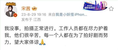 近日,網上有消息傳來,稱路人在去圍觀宋茜拍戲的過程中,由于人太多使秩序出現了混亂,由于大家的情緒極其的激動,導致宋茜的眼睛在推搡之中被雨傘的傘柄給戳到了,這一消息傳來之后,便立刻引發了宋茜粉絲的深入關心。就在粉絲紛紛為宋茜感覺到擔心之時,宋茜在自己的個人微博上針對這件事情也發文報了平安,先表示自己目前已經沒事了,拍攝也已經正常進行了,事情發生當時每一位工作人員都非常努力的護著自己,工作人員非常的辛苦,隨后宋茜又稱在場的每一個工作人員都在為了拍攝出一部好的電視劇而努力的,也希望大家可以體諒一下。