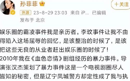 已經淡出娛樂圈的女演員孫菲菲,因為李紋錄音事件有感而發,在網上發文談到自己當年拍攝《血色戀情》時被導演策劃毆打的事情引發了網友的熱論。該劇男主王陽也發文回應,但是網友對于王陽的發文并不買賬,孫菲菲在王陽文章下方留言評論稱王陽當時并不在現場,請網友不要為難王陽,他是一個非常琢磨戲的人,自己特別欣賞他的這種工作態度。
