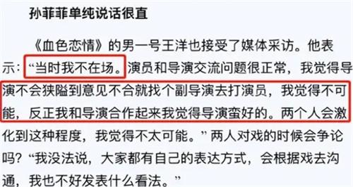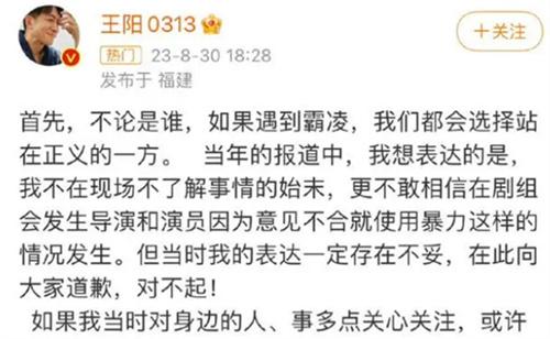 王陽說不可能的這個言論引發了網友的吐槽,直言當時王陽的回應太過于片面而王陽也因為當時的回應發文稱當時自己并不在現場,根本不了解事情的始末,更不敢相信導演會因為雙方的意見不合而對孫菲菲使用暴力,也直言當時的表達現在看來存在很多不妥的地方也向大家道歉。
