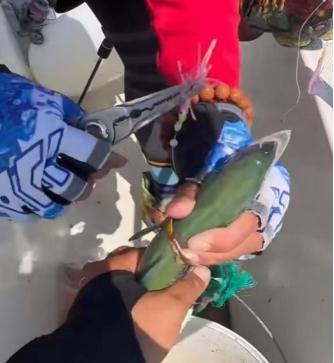 從陳先生所發布的視頻內容中,可以清晰的看到陳先生的釣友所釣上了的是一條青色的鲅魚,這條鲅魚的身體下部竟然被一個金色的鐲子給卡住了,鐲子的外觀也可以發現鐲子有一部分都已經生銹了,也可以看到,這個金色的手鐲應該在魚的上半部卡了有很長的一段時間了,這條魚的身體上還有著極其明顯的痕跡,這也就說明隨著魚不斷的長大,鐲子的一部分都已經進入到了魚的肉里,而這一情況也無疑的讓人感覺到萬分的觸動。