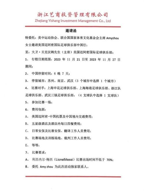 浙江的某個(gè)企業(yè)向貝克漢姆和邁阿密國際以及梅西本人發(fā)布了相關(guān)邀請,希望他們能夠在11月21號~27號來中國與中超球隊(duì)踢一場比賽,總的假期為七天六個(gè)晚上,而這一次地區(qū)是蘇州、南京、武漢三個(gè)地方選一個(gè)地方作為比賽的場地,而對陣的球隊(duì)極有可能是上海海港、上海申花、浙江隊(duì)、武漢三鎮(zhèn)這四支中超球隊(duì)當(dāng)中的一個(gè),同時(shí)在邀請函當(dāng)中還提到了要求梅西必須在場上有70%的上場時(shí)間,雖然現(xiàn)在并不知道這一張邀請函的真假,只能夠等待11月份,看看梅西是否會(huì)來到中國才能夠驗(yàn)證。