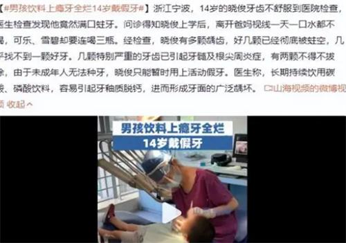 近日,根據(jù)媒體報道浙江寧波一名14歲的小男孩俊俊牙齒不舒服到醫(yī)院檢查,經(jīng)過醫(yī)生檢查發(fā)現(xiàn)竟然滿口蛀牙,經(jīng)過醫(yī)生問詢才得知俊俊只要離開爸爸媽媽的視線,一口水都不喝而雪碧、可樂這樣的碳酸飲料卻要連喝三瓶。經(jīng)過醫(yī)生的詳細(xì)檢查俊俊已經(jīng)出現(xiàn)了多顆齲齒,甚至有好幾顆牙齒都已經(jīng)被蛀空找不到一顆好牙,特別嚴(yán)重的牙齒已經(jīng)引起了牙髓以及根尖周炎癥,還有兩顆牙齒已經(jīng)到了不得不拔的地步,由于未成年人沒有辦法種牙俊俊只能夠暫時用上活動假牙。