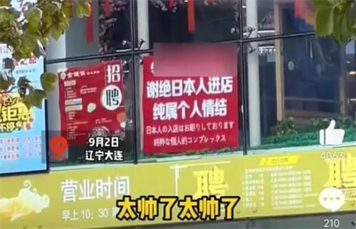 前不久大連市一家烤肉店掛牌寫了,謝絕日本人進(jìn)入。這家店鋪在門口懸掛了一塊告示牌,在告示牌上寫著謝絕日本人進(jìn)入純屬是個(gè)人情緒。這樣的舉動(dòng)引發(fā)了熱議和討論,很多網(wǎng)友都表達(dá)了自己的觀點(diǎn),這件事情引起人們對(duì)歷史情感的思考,同時(shí)也反映出人們對(duì)民族文化以及價(jià)值觀的關(guān)注。