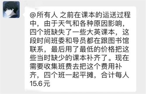 近日,山東臨沂大學(xué)學(xué)生爆料稱學(xué)校一個學(xué)院的英語課本在運送途中由于天氣和各種原因,導(dǎo)致部分課本丟失,網(wǎng)傳微信聊天截圖顯示需要四個班一起平攤,通過收集班費把費用補齊,合計每人15.6元,這一消息引起了人們的關(guān)注。