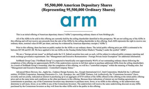 根據最新的一份向美國證券交易委員會提交的文件,Arm計劃發行9550萬股ADS,發行價格區間預計為每股ADS47美元到51美元之間,這也就意味著Arm至少需要在本次IPO活動中籌集到44.885億美元,才能成功上市。如今Arm的估值在478億美元到545億美元之間,這樣的規模和此前軟銀集團的預期相比要低一些,據此前消息,軟銀集團尋求的募資規模在80億到100億美元之間,估值大約能達到600億到700億美元之間。根據SEC文件中披露出的信息,本次發行之后軟銀集團的持股比例將會達到90.6%,如果承銷商完全行使超額配售權,持股比例將會降到89.9%。