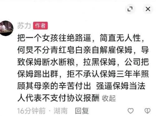 相關(guān)知情人爆料主要是保姆照顧母親的地方并不合格,因此辭退對(duì)方,為了給保姆繳納社保,才讓保姆入公司,用公司員工的名義開工資,但實(shí)際上只做了保姆的工作,因?yàn)楣窘o保姆發(fā)了工資,所以勞務(wù)報(bào)酬這塊并沒有付款,現(xiàn)在保姆想要求再給一份,并且賠償119元,何老師感覺非常的委屈。據(jù)了解一審判決需要何老師支付三年工資15萬(wàn),何老師不愿意被有心之人利用,要選擇繼續(xù)打官司,現(xiàn)在這位網(wǎng)友蘇力已經(jīng)將之前發(fā)的相關(guān)視頻全部刪除。