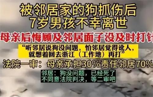 無奈之下王女士選擇向法院起訴,經(jīng)過判決,王女士承擔30%的責任,鄰居承擔責任為70%,不過鄰居不同意這樣的判決結(jié)果,向中級法院提出上訴。現(xiàn)在案件還在審理當中,后續(xù)結(jié)果會有官方發(fā)布通知,這件事也引起人們的反思。目前人類患上狂犬病的死亡率為100%,沒有治愈的方法,不過想要預(yù)防也很簡單,在被咬傷或者抓傷之后及時接種狂犬病疫苗即可。一般狂犬病毒能在狗身上潛伏很長時間,被狗咬了之后應(yīng)該第一時間注射狂犬疫苗和血清,因為疫苗至少要7到10天的時間才能產(chǎn)生抗體。這起事件中,王女士輕信了鄰居的說法,另外當事人可能也沒有采用科學的七日觀察法來觀測這只狗身上是否攜帶狂犬病毒,多人的疏忽最終導致了這起悲劇的發(fā)生。在此勸告大家在被動物抓傷或者咬傷的時候一定要提起警惕,及時接種疫苗。