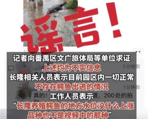 對(duì)于動(dòng)物園出逃的這件事,長(zhǎng)隆的有關(guān)工作人員表示,目前動(dòng)物園內(nèi)一切正常,沒有鱷魚出逃,工作人員告訴新聞?dòng)浾撸L(zhǎng)隆動(dòng)物園的養(yǎng)殖鱷魚水位沒有發(fā)生上漲的情況,并且動(dòng)物園的鱷魚品種與視頻中的鱷魚不符。余蔭山房工作人員明確表示,鱷魚出現(xiàn)的視頻在余蔭山房沒有發(fā)生。