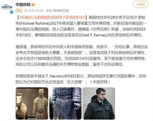 9月6日,曾經折斷兵馬俑手指的美國男子最終被費城聯邦法院判處了5年的緩刑。據了解,在2017年的時候,一名29歲的男子在夜間偷偷潛入到費城富蘭克林博物館內,這名叫做邁克爾羅哈納的29歲男子,在潛入到博物館內,偷偷的將一尊來自于中國的兵馬俑的手指折斷之后偷的放在自己的口袋里面離開此地。這件事情發生之后,在國際上引起了極大的轟動,但是由于案件較為特殊,最終在今年的9月6日才對這起案件中的涉事男子給予了法律上的懲罰。