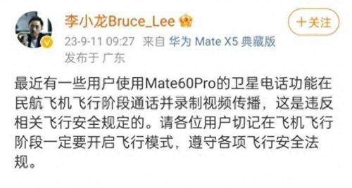 華為這款新機剛剛發售的時候上面的衛星電話功能就引起了不少人的好奇,在平常使用的手機上面根本沒有這項功能,不少博主紛紛在飛機上進行測試,有人發現在特定角度下通過窗戶可以連上衛星。不過這種行為被華為終端BG CTO李小龍注意到,他表示這種做法違反了相關的規定,并且希望大家不要這么做。實際上很多航空公司都強調過,手機等電子設備在聯網時會產生通訊電波,這會影響飛機的信號,也會影響設備運行,甚至干擾到飛機通訊,在飛機上盡量不要使用電子設備。