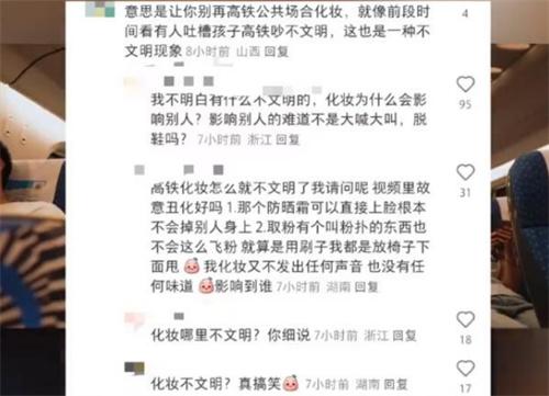 有很多網友在看到這條視頻之后,紛紛表示了自己的不滿情緒,有很多網友直接在下方評論到,在火車上出現翹腳的,有脫鞋的,騷擾乘客的以及孩子亂跑的這些不文明行為不去管,竟然直接管別人化妝。也有網友澤在下方提問,在列車上化妝都已經成為了不文明的行為,那么我在列車上看視頻時,將音樂放到最大,是不是也成為了不文明的行為?