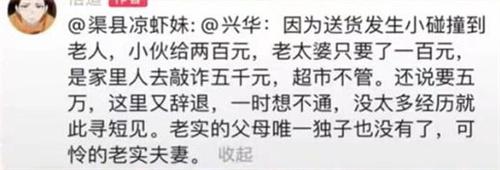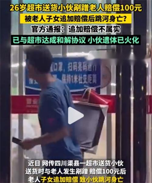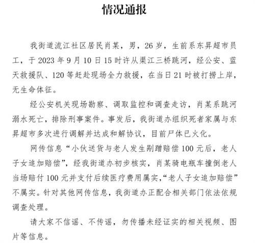 北京時間2023年9月10號下午15:30左右,四川渠縣公安局110接到了當地群眾報警稱有人在渠江三橋跳河。接到群眾報警之后藍天救援隊、120、公安民警等立即趕赴到跳河現場救援,當天晚上21點跳河人員肖某、26歲、男性被救援人員打撈上岸,當時已經沒有了生命體征。該跳河事件發生之后網上就有傳言肖某在為超市送貨的途中與一名老人發生了剮蹭,向對方賠錢之后又被對方的子女追加賠償,另外還被超市開除一時想不開隨后跳河身亡。