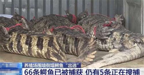 廣東茂名市茂南區一家鱷魚養殖場由于受到連日暴雨的影響9月11日出現圍墻崩塌。導致養殖場中數10條鱷魚逃脫,如今已經過去5天。截止到9月16日上午9點已經抓獲66條鱷魚,仍然還有5條正在抓捕當中。茂名官方于9月16日對此事進行回應表示目前仍然正在進行抓捕工作,到目前為止,并沒有發生鱷魚傷人的事件。當地的養殖戶表示鱷魚擁有非常高的經濟價值,可以用來制作名貴包包,也可以食用和入藥,擁有多種用途。