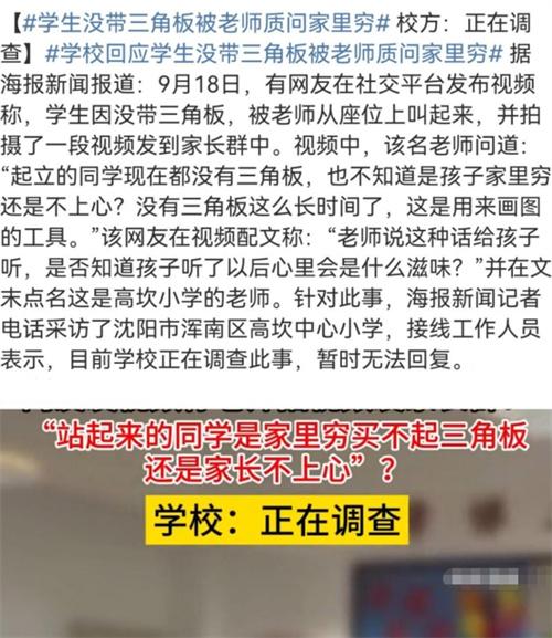 北京時間9月18日,在網上傳來消息稱,位于遼寧省沈陽市某所小學,由于一部分學生在上數學課的時候忘記帶三角板了。順便在家長群里面發布了一條視頻,并向家長質問究竟是家里窮買不起三角板,還是家長對于孩子的學習不上心,老師的這一言論也立刻引發了家長們的不滿情緒。