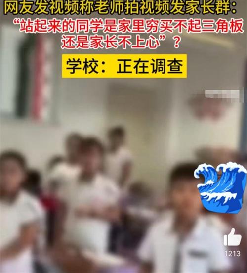 從這位老師所發布的視頻內容也可以看到,老師在課堂上忘記,帶三角板的學生全部都站了起來,并直接向所有學生表示,這些站起來的孩子都是沒有帶三角板的,也不知道這些孩子是家里窮買不起三角板,還是家長對孩子不上心。這條視頻的發布者表示是老師讓自己把視頻發到家長群的,有一部分家長在看到這條視頻之后,則直接提問的,作為一名老師,這樣說話究竟合不合適?
