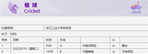 板球比賽在2010年廣州第16屆亞運會中也成為了正式的亞運會比賽項目,杭州亞運會的板球比賽本次采用的是20回合制度,浙江工業大學板球場的地址位于杭州西湖區,比賽結束之后也可以作為師生的活動中心。19號當天舉行的沙灘排球項目的半邊山沙灘排球中心的地點在寧波象山縣,該排球中心面朝大海還包含了可以容納2000名觀眾在現場觀看比賽的c字形半開放式主場館、熱身場地、訓練場、副場館等等。
