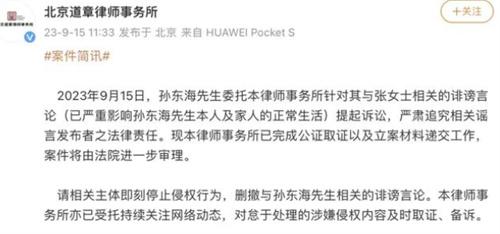近日,網上傳言張柏芝起訴三胎孩子的生父孫東海家暴,張柏芝和孫東海兩人為了爭奪孩子的撫養權對簿公堂等話題引發了大眾的熱議。北京時間9月15號孫東海委托律師針對網上的誹謗提起訴訟,將會嚴肅追究網上的謠言發布者的法律責任。目前已經完成了公證取證以及立案材料的遞交工作,造謠案件也將會由法院進一步受理,男方也否認三胎和自己無關。