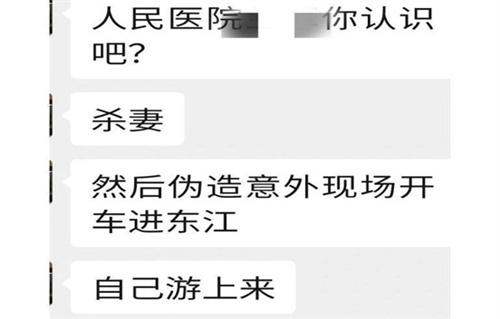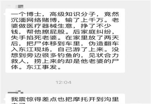 從網絡中流傳出來的聊天記錄中,顯示這名醫生因為沉迷網絡賭博收掉了上千萬之后,因為家庭矛盾不小心掐死了自己的老婆之后將尸體在家中存放兩天。最終轉移到車里偽造成翻車掉入東江之后,自己從旁邊游了上來,但沒有想到東江旁邊有許多釣魚的人員,最終將他的老婆撈了上來。