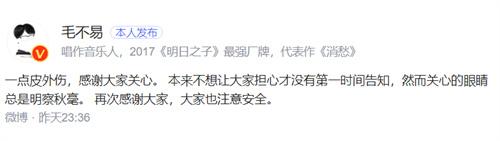 9月23日,知名歌手毛不易在演出的時候因為右手一直插在兜中引起很多網友的熱議,很多網友對毛不易的右手感到關注和好奇。究竟是什么原因讓毛不易會做出這樣的舉動呢?針對此事毛不易在個人社交媒體發表回應,在動態中寫道,感謝大家的關心,由于右手最近受了一些皮外傷所以演唱的時候一直插在口袋。這樣做也是不想讓大家擔心,所以才沒有告訴大家,不過關心的眼睛總是會明察秋毫,在這里還是非常謝謝眾位粉絲。