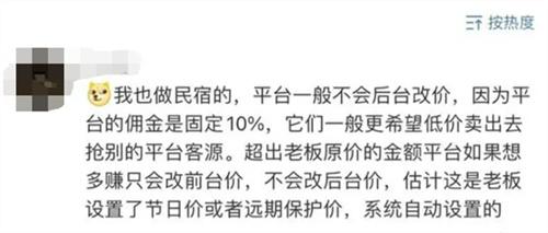 有一位網(wǎng)友在看到這條消息后,稱自己就是開民宿的,開民宿的網(wǎng)友表示平臺在一般情況下并不會從后臺去調(diào)整民宿的價格,因為每一家民宿在掛上平臺之后,平臺都會抽取10%的固定的傭金。正常情況下,這些平臺更希望能夠以較低的價格將酒店給預(yù)定出去,而這家民宿的價格之所以會發(fā)生如此大的變化。很有可能是這家老板設(shè)置了節(jié)日價格,或者是系統(tǒng)自動對民宿價格去進行的調(diào)整。