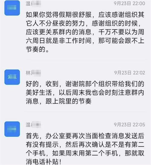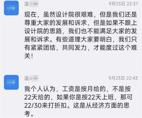 北京時間9月26日,網絡上有多張釘釘截圖引發了社會各界的深入關注。從這些截圖的消息來看,全部都是工作群內的聊天截圖,從網上所傳播的相關消息顯示,江西某家國企建筑設計院的院長在釘釘的工作群內發言,與公司在周六都有半天的休息時間。然而員工在這半天的休息時間內都不看消息,因此就在釘釘群里面告誡大家,讓大家千萬不要認為周六和周日這兩天是休息日,在這兩天也千萬不要有關機的概念,最后這位叫做溫某的設計院院長又在群里面告訴員工,經過思考之后自己決定在明年的周六周日也將會去實行工作制度。在提到員工的工資時,更是直接表示員工的工資是按照每個月去發放的,并不是按照每個月的22天去發放的。